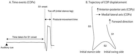 Time events of the COP displacement are presented in Figure 3A. The duration between the start cue and S1 period onset (time taken for the S1 onset) was calculated. The time at the toe-off of the initial stance leg was defined as the moment at which the COPx displacement ended. The duration between the onset of the S1 period and toe-off of the initial stance leg (postural movement time) was calculated.