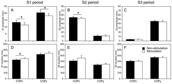 The duration and amplitude of the COP displacement in the S1 period are shown in Figure 6A,D. The amplitude of the COP displacement in the stimulation condition was significantly smaller than that in the non-stimulation condition either in the anterior–posterior (COPy, p = 0.047) or medial–lateral axis (COPx, p = 0.030). The duration of the COP displacement in the stimulation condition was significantly longer than that in the non-stimulation condition in the medial–lateral axis (p = 0.014) but was not significantly different between the two conditions in the anterior–posterior axis (p = 0.224).