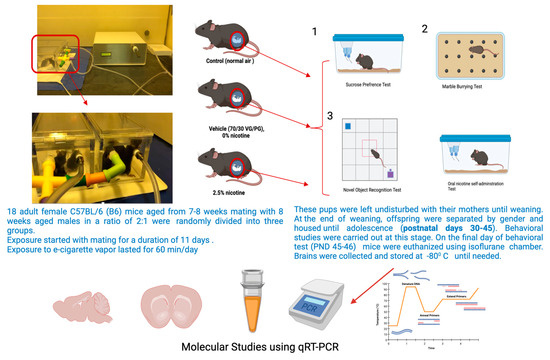 For these reasons, this project is significant and innovative and will aid in filling the gaps in knowledge regarding e-cigarettes and brain behavioral functions during that period. Our central hypothesis was that first-trimester prenatal exposure to e-cigarettes induces subsequent neurobehavioral changes that are a phenotypic signature of psychiatric disorders during adolescence. These might be mediated by glutamatergic connections. A schematic of the study design is presented in Figure 1.