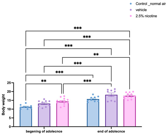 Body weight analyses of adolescent mice following first-trimester prenatal exposure to e-cigarettes. Bodyweight tracking in the adolescent mice at the beginning and end of adolescence in the tested groups. The body weight remained significantly increased throughout adolescence (n = 9 control, vehicle 9, and 12 mice in 2.5%-nicotine-exposed groups). Data were analyzed using a two-way ANOVA followed by Tukey’s multiple comparisons tests (data are presented as weight changes in grams (means + SEMs). Asterisk Significantly different when compared to controls. ** p < 0.01; *** p < 0.001.