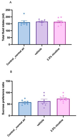 Sucrose neophobia test among tested groups. (A) Analysis of total fluid consumption among the tested groups in milliliters (n = 7 in the control and vehicle groups and 9 in the 2.5%-nicotine-exposed group). (B) Analysis of the amount of sucrose consumed—initial exposure—(n = 8 in control, 9 in vehicle, and 12 in 2.5%-nicotine-exposed groups). Data were analyzed using a one-way ANOVA followed by Tukey’s multiple comparisons tests (presented as means + SEMs).