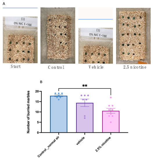 Marble-burying behavior among tested groups. (A) Representative images of the test at the beginning and after thirty min. (B) Quantification of the number of buried marbles in the tested groups (n = 7 in the control and vehicle groups and 9 in the 2.5%-nicotine-exposed group). Data were analyzed using a one-way ANOVA, followed by Tukey’s multiple comparisons tests (presented as means + SEMs). Asterisk Significantly different from the control, ** p < 0.01.