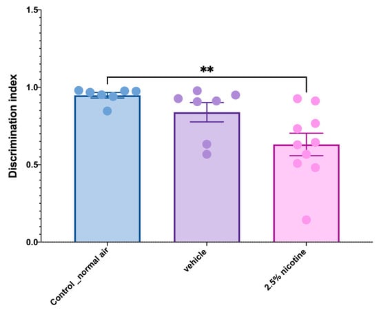The analysis of recognition memory using a discrimination index as an end measurement revealed that the adolescent mice exposed to the 2.5% nicotinic e-cigarettes exhibited a significant reduction in recognition memory compared to the normal-air group (p < 0.01), as indicated in Figure 5.