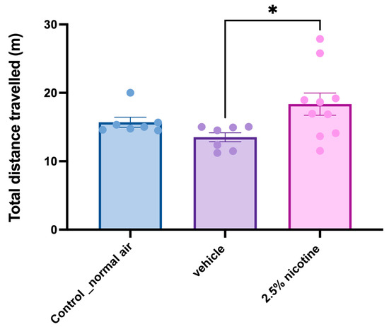 The analysis of locomotor activity measured the total distance travelled. Our one-way analyses indicated that adolescent mice exposed to the 2.5% nicotinic e-cigarettes exhibited a significant elevation in distance travelled compared to the vehicle group (p < 0.05), as displayed in Figure 6.