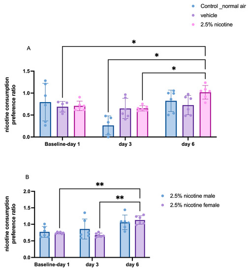 Investigating nicotine consumption ratio. (A) nicotine consumption ratio at three time-points, day 1, day 3, and day 6, using a repeated measures two-way ANOVA followed by Tukey’s multiple comparisons tests. (B) Quantification of nicotine consumption ratio in both genders in 2.5%-nicotine-exposed group using a two-way ANOVA followed by Tukey’s multiple comparisons tests (n = 6 mice per group). Data are presented as means + SEMs. Significantly different from the controls, * p < 0.05; ** p < 0.01.