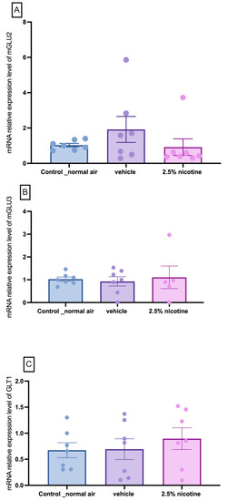 Our study design was based on prenatal exposure to e-cigarettes. We postulated that prenatal neuronal programming might interfere with GLT1 expression. Pregnant females were exposed to 2.5% nicotine for the first ten gestational days. According to the Allen Brain Atlas, the expression levels of astroglia markers, including glial fibrillary acidic protein and S100, the neurotrophic calcium-binding protein, are at higher levels in the first ten days of pregnancy in the embryonic mouse brain than in other embryonic developmental stages. Later, in early postnatal stages, their levels of expression increase. This indicates that astroglia cells are moderately raised during the first trimester and the postnatal period [58], which may justify the trend toward elevated GLT-1 levels in our study as compared to other cells, astroglia cells predominately express GLT-1.