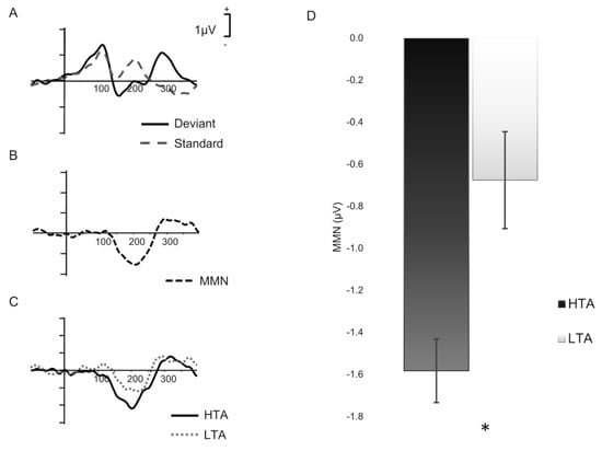 (A) Deviant (continuous black line) and standard (dashed grey line) stimuli ERP waveforms in the entire sample (N = 36). (B) MMN waveform (deviant minus standard) at Fz electrode site for all participants and (C) for HTA (continuous line) versus LTA (dotted line) groups. (D) Bar plot shows the MMN amplitude at Fz between HTA and LTA subjects following median split; * indicates significant differences; error bars represent standard error of the mean. Abbreviations: HTA: high-trait anxiety LTA: low-trait anxiety; μV: microvolt; MMN: mismatch negativity.