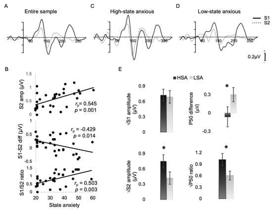 Grand average waveforms for the S1 (continuous line) and S2 (dotted line) stimuli at Cz superimposed onto each other for (A) the entire sample, (B) the subaverage of the high-state anxious, and (C) low-state anxious participants. (D) Scatterplots displaying the linear associations of the S2 amplitude, P50 difference, and P50 ratio with state anxiety on the right-hand side. Partial correlation coefficients and associated p-values show the strength of these correlations and the probability these were observed due to chance. (E) Bar plots for the sensory gating parameters (S1 and S2 amplitude, S1–S2 difference and S2/S1 ratio), showing the differences between HSA and LSA groups following median split; * indicates significant differences; error bars represent standard error of the mean. Abbreviations: HSA: high-state anxiety; LSA: low-state anxiety; ms: milliseconds; μV: microvolt; S1: stimulus S1; S2: stimulus S2.