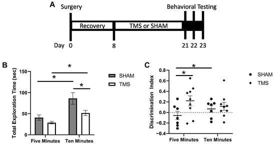 Given the sample size of n = 7 and n = 9 in each group, an expected effect size of 1.5 in the object recognition test, determined based on previous work [], and p < 0.05, we were able to achieve a power of 0.79 for this preliminary analysis (G*Power 3.1, []). Data were first tested to confirm if they met assumptions of normality as assessed by examining the skewness, kurtosis and the Shapiro–Wilk value of the calculated residuals. Student’s t-tests were used to compare SHAM to TMS, and between five- and ten-minute-time-point paired t-tests were used. We tested for violations of homogeneity of variance using Levene’s statistic. If the homogeneity of variance was violated, significance was determined with the Welch Test, this case is noted in the results. All statistics were performed using SPSS (version 22, IBM, Armonk, NY, USA) and graphs produced using GraphPad (version 7, Prism, San Diego, CA, USA).