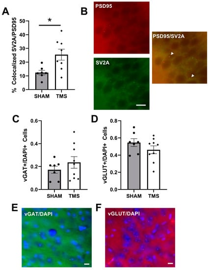 We explored the colocalization of SV2A, a marker of synaptic vesicles in the pre-synapse of both glutamatergic and GABAergic neurons with PSD95, a scaffolding protein in post-synapse of glutamatergic neurons. Colocalization of these puncta indicate active glutamatergic synapses in the CA1 []. rTMS stimulation to the cerebellum increased the colocalization of SV2A and PSD95 in the CA1 to 25.44% (±0.04), compared to 12.42% (±0.02) for the SHAM mice (Welch’s t-test, p < 0.05; Figure 2A). To examine the overall balance of glutamatergic and GABAergic neurons, we next determined the presence of neurons containing vGLUT or vGAT in the frontal cortex. vGLUT is a marker of vesicular glutamate transporters expressed in glutamatergic neurons, and vGAT is a marker of vesicular GABA transports expressed in GABAergic neurons. There was no difference between mice treated with rTMS and SHAM (Figure 2C,D).
