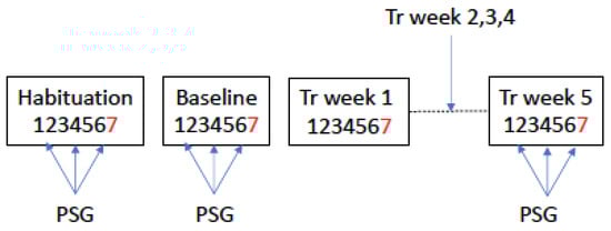 Flow chart of the study. Baseline and 5 treatment weeks. PSG was recorded on either Tuesday, Wednesday, or Thursday in the baseline week, or weeks 2, 5, and 10 (weeks 2 and 10 are not reported here). The ISI was administered at the end of the baseline week and each treatment week (“7”). The numbers 1–7 represent days of the baseline and treatment weeks. “Tr” = treatment. Note that “weeks” do not represent calendar weeks, but the weeks from the start of treatment.