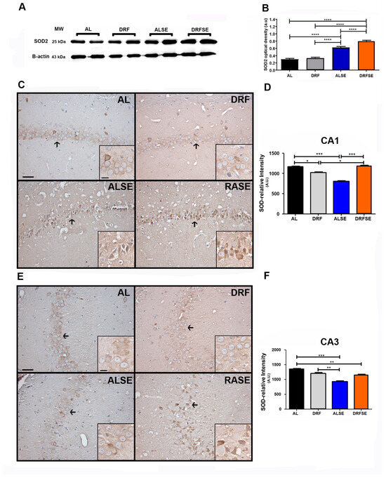 Due to the fact that superoxide dismutase 2 (SOD2) is a downstream protein of the Nrf2 signaling pathway [10], we evaluated the mitochondrial SOD2 levels in the hippocampal homogenates through Western blotting. In this regard, we observed that the ALSE group showed a significant increase in SOD2 protein content compared to the AL and DRF groups (p < 0.0001, Figure 5A,B). Notably, daytime-restricted feeding increased the SOD2 protein content after pilocarpine-induced seizures compared to the ad libitum pilocarpine-induced seizure (p < 0.0001, Figure 5A,B). Then, we evaluated the relative intensity of the SOD2 immunoreactivity of the pyramidal cell layer of the CA1 and CA3 subfields. Unlike the previous results in the SOD2 protein content in the hippocampal homogenates, we observed a significant decrease in the relative density of SOD2 immunostaining in pyramidal neurons of CA1 in the ALSE group compared to the AL group (p < 0.001, Figure 5C,D, arrows). Interestingly, the restrictive diet was able to significantly increase the immunoreactivity of SOD2 in the pyramidal cell layer of CA1 compared to the ad libitum pilocarpine-induced seizure (p < 0.001, Figure 5C,D, arrows). Similar results were observed in the CA3 region. There was a significant decrease in the relative density of SOD2 immunostaining in the pyramidal neurons of CA3 in the ALSE group compared to the AL- or DRF-alone groups (p < 0.001 and p < 0.01, respectively, Figure 5E,F, arrows). Notably, there was more of a tendency to increase the immunoreactivity of SOD2 in the DRFSE group than in the ALSE group; however, there were no statistically significant results (Figure 5E,F, arrows).