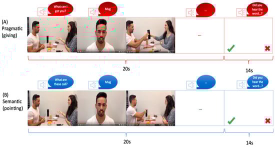 Each video depicted two individuals (referred to as the “Partner” and the “Speaker”) sitting across from each other at a table with eight objects placed on it (Figure 1). The video sequence began with the Partner uttering a context sentence, such as “What are these called?” or “What can I get you?” which determined the speech act in which the Speaker would pronounce the critical word. Following the context sentence, six of the eight objects on the table were named. Depending on the context sentence, the critical word was expressed as either a Naming or a Request speech act. Previous studies have utilized these two conditions to explore pragmatic and semantic language processing. Naming objects has been associated with semantic language processing, while performing an action has been linked to pragmatic language processing [48,49]. Each video had a duration of 20 s (Figure 1). A male and a female speaker were involved in the video recordings, with both individuals taking turns as the Partner and the Speaker in half of the videos. The left-right positions were also counterbalanced, with each position used in half of the videos. Apple’s iMovie 10.1 software was employed for video editing, and the complete blocks of videos were presented using Presentation Software. The same critical words and objects were used in both sets of videos. In order to ensure participant attention, a word was presented at the end of each block, and participants were asked if they had heard that word during the video.