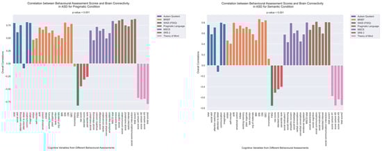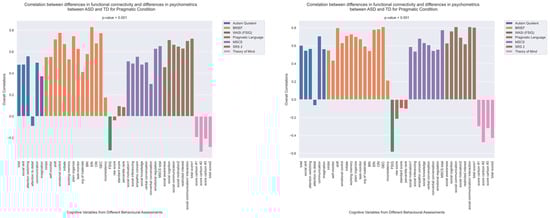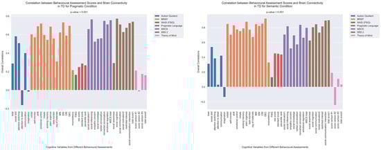 While numerous studies have delved into atypical brain–behavior relationships in ASD, our research is novel in multiple respects. While prior work has predominantly focused on distinguishing ASD and TD characteristics through resting-state fMRI brain connectivity patterns [77,78,79] with connectivity estimated during cognitive tasks [20,80,81,82,83], our study occupies a unique niche. Our first set of analyses emphasizes associations between psychometrics and pragmatic and semantic language processing. The second set directly contrasts differences in brain–behavior associations between the ASD and TD groups.