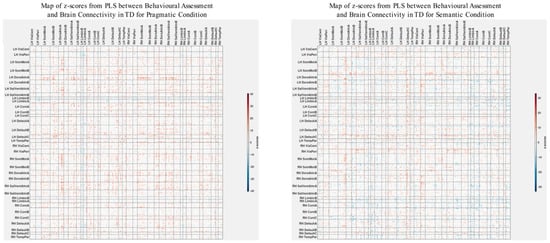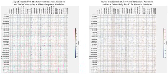 The patterns of overall brain–behavior correlations, which are represented by the first latent variable that explains the largest portion of the covariances p for ASD and TD, are presented in Figure 2 and Figure 3, respectively. The corresponding maps of z-scores for ASD and TD are presented in Figure 4 and Figure 5, respectively. Upon visual inspection, we observe consistent patterns of overall brain–behavior correlations in the typically developing (TD) group across both semantic and pragmatic conditions, as depicted in Figure 3. The directionality of these effects—whether correlations are positive or negative—is, on average, maintained across all psychometric measures employed. The robustness of these observed effects is supported in brain space by large in magnitude, positive and negative z-scores, as illustrated in Figure 5. In the context of the prevailing pattern of positive correlations, these z-scores serve as indicators of the corresponding positive and negative brain–behavior relationships, respectively.