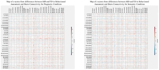 The pattern of overall correlations between brain connectivity and psychometric measures in the ASD group diverges qualitatively from that observed in the TD group. Specifically, the directionality of the overall brain–behavior correlations in ASD is inconsistent across different psychometric categories. A subset of variables—namely, those related to IQ (WASI), pragmatic language, and Theory of Mind—exhibits a contrasting pattern compared with the remaining variables. This divergence is consistent across both semantic and pragmatic conditions, as shown in Figure 2. The supporting map of z-scores corresponding to these overall correlations is presented in Figure 4. In the ASD group, higher connectivity between ROI pairs with positive z-scores correlates with elevated scores in the Autism Questionnaire, BRIEF, MSCS, and SRS-2 but lower scores in WASI, pragmatic language, and Theory of Mind. Conversely, higher connectivity between ROI pairs with negative z-scores is associated with lower scores in the Autism Questionnaire, BRIEF, MSCS, and SRS-2 but higher scores in WASI, pragmatic language, and Theory of Mind.