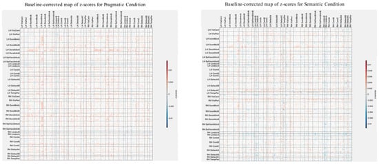 To carry out baseline normalization, we first normalize the z-score matrices shown in Figure 4 and Figure 7 using L2 normalization. This involves dividing each matrix element by the square root of the sum of squares of all elements within the matrix. This subtraction process is executed separately for both the semantic and pragmatic conditions. Figure 8 displays the z-score maps derived from analyzing correlations between group differences in brain connectivity and psychometric scores (as seen in Figure 7) but now adjusted relative to the baseline set by the z-scores from the ASD-only analysis of brain connectivity and psychometrics (as shown in Figure 4).