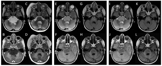 MRI images of a child treated with three courses of radiotherapy: at baseline, the mass located in the pons appeared to protrude and partially obliterate the prepontine cisterns, embrace the basilar artery, displace the cerebellar vermis and middle cerebellar peduncles, and compress the fourth ventricle and Sylvian aqueduct. It appeared to be (A) hyperintense in T2-weighted and FLAIR sequences and (B) hypointense in T1-weighted sequences. After the first radiotherapy course, the mass decreased, and it was neither obliterating prepontine cisterns nor compressing the fourth ventricle; furthermore, the basilar artery appeared to be free. The mass appeared to be (C) less hyperintense in T2-weighted and FLAIR sequences (almost isointense) and (D) less hypointense in T1-weighted sequences. At first recurrence (E,F), the mass was again obliterating prepontine cisterns and imprinting the fourth ventricle. After the second radiotherapy course (G,H), a considerable reduction in the lesion was seen with all ventricles appearing regular and symmetric. At the second recurrence (I,J), the lesion appeared to have increased again and extended to the midbrain and posterior cranial fossa, toward cerebellar tonsils. After the third radiotherapy course (K,L), a partial reduction in the mass was seen.