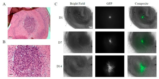 Figure 2A–C). Variations in size, growth rate, and shape of tumour masses were observed. The haematoxylin and eosin staining of the tumours in the brain slices suggested patterns of growth and tissue invasion resembling higher-grade tumours (see Louis et al. (2016) [