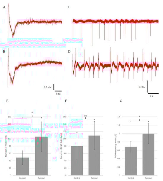 Using this protocol, the tumour-injected organotypic hippocampal slices were found to be hyperexcitable compared with the control slices as they exhibited much higher rates of PAD events following high-frequency electrical stimulation (