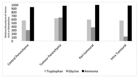 Levels of neurotransmitters and metabolites such as tryptophan, glycine, and ammonia could be measured from the microvolume fluid samples. Quantitative mass spectrometry was used to detect these constituents and quantify them using area under the curve (AOC) measurements, which allowed comparisons between control and tumour slices as well as intra-slice comparisons. AOC measurements (