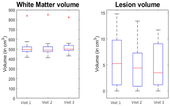 Change in white matter and lesions volumes (7T MPRAGE) during the study. Visit 1: baseline. Visit 2: 6 months. Visit 3: 12 months. The red line is the median, with the bottom and top edges of the box indicating the 25th and 75th percentiles, respectively. The whiskers extend to the most extreme data-points not considered outliers, and the red cross is showing the individual outliers.