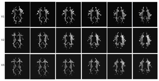 A sample of CEST masks of NAWM (images from different anatomical levels for each visit) from one study participant is presented in Figure 4.