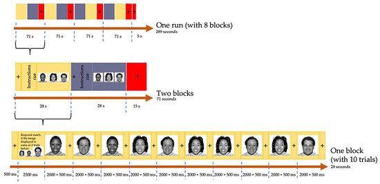 This block-based design spanned over a set of 2 runs of 8 blocks each, with an equal number of blocks for each condition (0-back/2-back, 4 blocks per condition per run), as shown in Figure 1. The order of blocks was randomized into 4 sets and these sets were counterbalanced for each subject. The fixation cross (for 0.5 s) and instruction cue (for 2.5 s) were placed at the start of each block, followed by a sequence of 10 trials (2.5 s per trial). Each trial consisted of a visual stimulus (for 2 s) followed by a fixation cross (for 0.5 s). The visual stimuli included faces (happy, neutral, fearful) and places. Each block lasted for 28 s. A fixation cross was placed after every 2 task blocks and at the end of each run (for 15 s and 5 s, respectively). Each run lasted for 289 s.