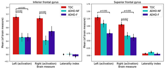 Group comparisons of ROI-based brain activation and laterality. Each bar shows the mean value involving all the subjects of each respective group (the mean values presented here for the TDC group include subjects of both sub-samples). (ROI: region of interest; TDC: typically developing children; ADHD: attention deficit/hyperactivity disorder; ADHD-NF: non-familial ADHD; ADHD-F: familial ADHD).