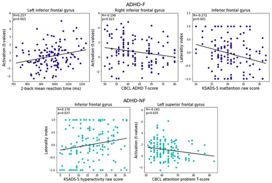 In children with ADHD-F, the mean activation in the left IFG was significantly positively correlated with the 2-back RT (p = 0.003), the mean activation in the right IFG was significantly negatively correlated with the CBCL ADHD T-score (p = 0.021), and the LI in the IFG was significantly negatively correlated with the KSADS-5 inattention raw score (p = 0.001). In children with ADHD-NF, the LI of the IFG showed a significant positive correlation with the KSADS-5 hyperactivity raw score (p = 0.037); the mean activation in the left SFG showed a significant negative correlation with the CBCL attention problem T-score (p = 0.025) (Figure 4).