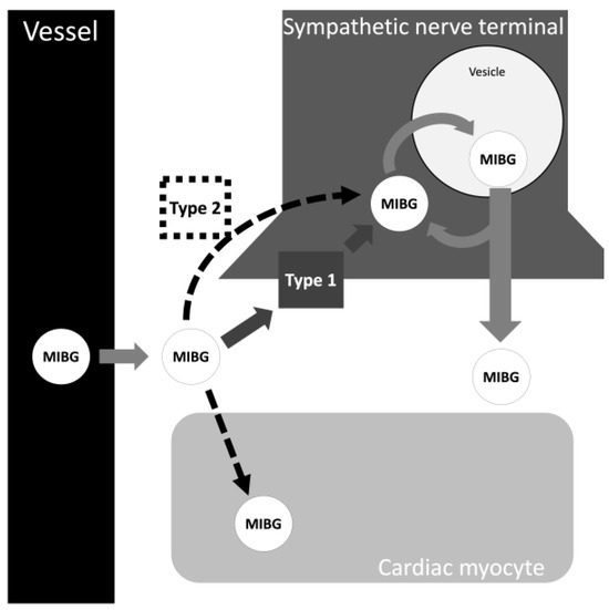 There are two types of MIGB uptake mechanisms in neuroendocrine cells (Figure 1). These mechanisms are based on MIBG concentration. In low concentrations of MIBG (uptake type 1), an active pathway dependent on sodium and adenosine triphosphate is chosen. Noteworthy, this is the dominant method of transport of MIBG into cells and is more efficient and specific than type 2 [17]. When inside the cell, MIBG is transported into the storage granules through an energy-dependent transport mechanism via vesicular monoamine transporters 1 and 2. A small portion of MIBG stays in the cytoplasm. When there are high concentrations of MIBG, a pathway called uptake type 2 (extraneuronal uptake) can occur. The mechanism is based on the passive transport of simple diffusion of MIBG into the cells. Interestingly, delayed images are less dependent on uptake type 2 and more accurately reflect cardiac sympathetic nerve activity and pathological findings, but the dose of MIBG may influence these features [18].