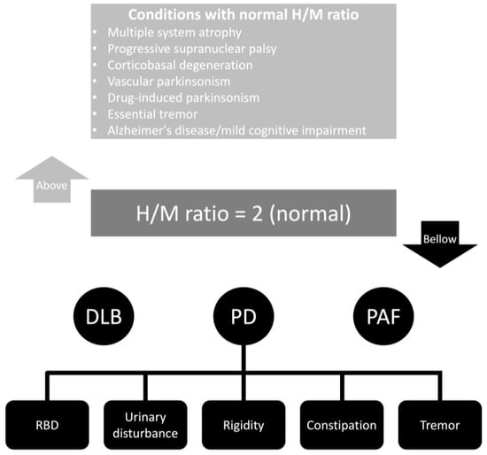 Cardiac autonomic denervation is observed in Lewy body disorders, including PD, dementia with Lewy bodies, and pure autonomic failure. The difference between PD and dementia with Lewy bodies is according to the main anatomical distribution of the Lewy body type-degeneration, which, for patients with PD, is in the basal ganglia and for individuals with dementia with Lewy bodies, is in the neocortical areas. In this context, cardiac MIBG uptake will be reduced in PD and dementia with Lewy bodies. Therefore, cardiac scintigraphy cannot differentiate these conditions [166]. Interestingly, the reduction in cardiac MIBG uptake in early and delayed H/M ratios is more significant in dementia with Lewy bodies than in patients with PD (1.47 ± 0.15 vs. 1.28 ± 0.13, p < 0.01; 1.78 ± 0.27 vs. 1.62 ± 0.38, p < 0.01) [167]. Moreover, a multicenter study on individuals with dementia with Lewy bodies found that the sensitivity and specificity of MIBG increased with the progression of the disease [168]. A similar effect on cardiac MIBG uptake was previously observed in patients with PD.