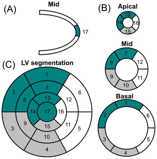 Polar map of cardiac perfusion. (A) Vertical long axis; (B) short axis; and (C) left ventricular (LV) segmentation. Coronary artery territories: left anterior descending artery (dark green); right coronary artery (gray); left circumflex artery (white). Segments: (1) basal anterior; (2) basal anteroseptal; (3) basal inferoseptal; (4) basal inferior; (5) basal inferolateral; (6) basal anterolateral; (7) mid anterior; (8) mid anteroseptal; (9) mid inferoseptal; (10) mid inferior; (11) mid inferolateral; (12) mid anterolateral; (13) apical anterior; (14) apical septal; (15) apical inferior; (16) apical lateral; (17) apex.