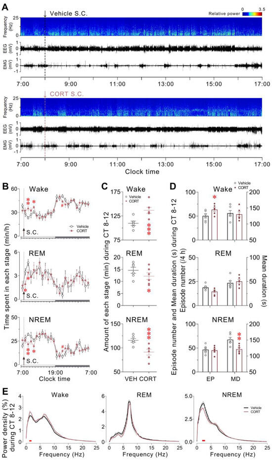 Acute CORT administration induced a rapid increase in wakefulness and a decrease in REM and NREM sleep accompanied by the altered EEG delta power. Mice received vehicle or CORT injection at ZT 1 (8:00 a.m.). (A) Typical examples of relative EEG power and EEG/EMG traces over a 10 h light period. The dashed line represents the vehicle (black) or CORT (red) injection. (B) Time course changes in wakefulness, REM sleep, and NREM sleep over a 24 h period following vehicle or CORT injection, marked by dashed lines. Data are subdivided into 60 min bins. The white and black bars above the x-axes indicate the light and dark phases, respectively. (C) Total time spent in each stage, (D) Episode number and mean duration of each stage and (E) EEG power density of each stage during the 4 h time window after vehicle or CORT injection. Values are presented as means ± SEM. (B) n = 6; two-way ANOVA (ZT 1 to 5), F1, 10 = 5.778 (Wake), 5.853 (REM), 5.402 (NREM), p = 0.0371 (Wake), 0.0361 (REM), 0.0425 (NREM), Bonferroni post hoc test, * p < 0.05, ** p < 0.01; two-way ANOVA (ZT 14 to 16), F1, 10 = 5.546 (Wake), 1.147 (REM), 5.533 (NREM), p = 0.0403 (Wake), 0.3094 (REM), 0.0405 (NREM), Bonferroni post hoc test, # p < 0.05; (C,D) n = 6; paired t-test, * p < 0.05, ** p < 0.01, *** p < 0.001; (E) n = 6; paired t-test, p < 0.05 is indicated by the red horizontal lines. CORT, corticosterone; CT, clock time; EP, episode number; MD, mean duration; NREM, non-rapid eye movement; REM, rapid eye movement; S.C., subcutaneous injection; VEH, vehicle.