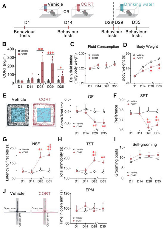 Chronic CORT administration elevated CORT levels and induced depressive-like behaviour in mice. (A) Schematic of the experimental procedure. Mice received 4-week administration of either vehicle or CORT via drinking water (D1 to D28), followed by a 1-week drug withdrawal period (D28 to D35). The short grey and red bars represent the timepoints of behaviour tests and plasma CORT determination, respectively. (B) Time course changes in plasma CORT levels across chronic administration and post-drug withdrawal period. (C) Fluid consumption and (D) Body weight monitored across chronic administration and post-drug withdrawal period. (E) Tracing of locomotion of representative animals on D28 (black: vehicle group; red: CORT group) and the ratio of time spent in the center zone to the total area during the OF test. (F) The ratio of sucrose water intake relative to total sucrose and regular water intake during the SPT. (G) The latency to the first food bite during the NSF test. (H) Duration of immobility during the TST. (I) Count of spontaneous grooming bouts within the 30 min observation window. (J) Tracing of locomotion of representative animals on D28 (black: vehicle group; red: CORT group) and time spent in the open arm during the EPM test. All double slashes on the x-axes signify the drug withdrawal. Values are presented as means ± SEM. (B) n = 6 per group; unpaired t-test, * p < 0.05, ** p < 0.01, *** p < 0.001; (C) n = 6 per group; (D–J) n = 9 in vehicle group, n = 12 in CORT group; (C–J) two-way ANOVA, F1, 10 =1.196 (fluid consumption), F1, 19 = 11.19 (body weight), 6.367 (OF), 9.861 (SPT), 10.76 (NSF), 11.72 (TST), 1.361 (Self-grooming), 0.0515 (EPM), p = 0.3240 (fluid consumption), 0.0034 (body weight), 0.0207 (OF), 0.0054 (SPT), 0.0039 (NSF), 0.0028 (TST), 0.2578 (Self-grooming), 0.8229 (EPM), Bonferroni post hoc test, * p < 0.05, ** p < 0.01 compared to vehicle group; paired t-test, # p < 0.05, ## p < 0.01, ### p < 0.001 compared to CORT group on D1. CORT, corticosterone; EPM, elevated plus maze; NSF, novelty suppressed feeding; OF, open field; SPT, sucrose preference test; TST, tail suspension test.