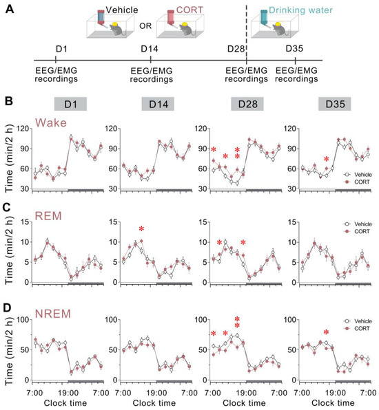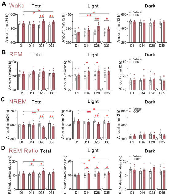 We proceeded to compare the total amounts of time spent in the wake, REM sleep, and NREM sleep stages, and the REM sleep ratio during 24 h, the light phase, and the dark phase, throughout and following the chronic CORT exposure regimen. The increase in wake amounts induced by CORT administration during an entire 24 h cycle reached statistical significance on D28 (p = 0.0080) and persisted until D35 (p = 0.0052), 7 days following drug withdrawal, in comparison to vehicle control or the CORT group on D1 (D28, p = 0.0300; D35, p = 0.0430) (Figure 4A). Concomitantly, total NREM sleep duration was significantly decreased on D28 and D35 relative to the vehicle control (D28, p = 0.0020; D35, p = 0.0056) or the D1 level of CORT-exposed mice (D28, p = 0.0053; D35, p = 0.0477) (Figure 4C).