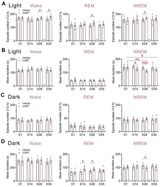 Our analysis revealed that the episodes of wakefulness were significantly increased on D28 of CORT exposure (p = 0.0402) and persisted 7 days later (p = 0.0479) during the light phase (Figure 5A), which accounted for the observed increase in wakefulness on these two days (Figure 4A). Interestingly, during the light phase, 28 days of CORT administration led to a significant increase in REM sleep episodes (p = 0.0449), while 14 days showed a trend to an increase (p = 0.1460) (Figure 5A), contributing to the increase in REM sleep during these two light phases (Figure 4B). By contrast, the mean duration of REM sleep was significantly prolonged during the dark phase on both D14 (p = 0.0231) and D28 (p = 0.0465) of CORT administration (Figure 5D). NREM sleep, on the other hand, exhibited a significant increase in episode number on the last day of CORT administration during the light phase (p = 0.0362) (Figure 5A), despite a dramatic reduction in the total NREM sleep amounts on this day (Figure 4C). The mean duration of NREM sleep displayed a remarkable decrease on D14 (p = 0.0377) and D28 (p = 0.0009), relative to the vehicle control, during the light phase (Figure 5B), most likely contributing to the reduced NREM sleep during this phase on D28 (Figure 4C). This reduction in mean duration during the dark phase reached significance on D28 as well (p = 0.0464) (Figure 5D).