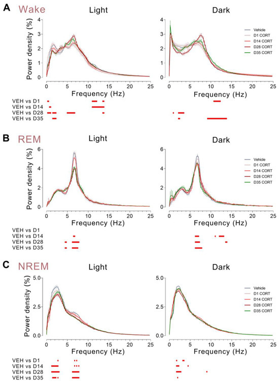 To examine the effects of chronically elevated CORT levels on sleep quality, EEG power spectra were analyzed. For the wake state, during the light phase, there was a significant decrease in EEG power within the delta band across all days tested post-D1, contrasting with increased EEG power within the theta range (6–10 Hz) found on D28 of CORT administration. EEG power within the alpha range (12–14 Hz) was decreased across chronic administration (D1, D14 and D28). By contrast, changes during the dark phase were less pronounced, with delta power decreased on D28 and D35, theta power increased on D35, and alpha power increased on D1 and D35, relative to the vehicle control (Figure 6A). Nevertheless, alterations in wake EEG power density point towards heightened attentiveness and alertness in mice following chronic CORT exposure.