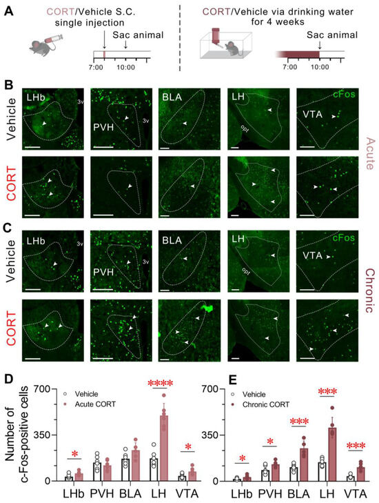 Effects of acute and chronic CORT administration on c-Fos protein expression in certain brain regions. (A) Schematic of the experimental procedure. Mice received either an acute CORT/vehicle injection (at ZT 1) or underwent chronic CORT/vehicle administration via drinking water for 4 weeks, followed by sacrifice at ZT 3. (B,C) Representative immunostaining images showing c-Fos-positive cells (green, marked by white arrowheads) in five distinct brain regions following (B) acute or (C) chronic CORT exposure, and the vehicle control. Scale bar, 200 μm. (D,E) Number of c-Fos-positive cells in five brain regions following (D) acute or (E) chronic CORT exposure, and the vehicle control. Values are presented as means ± SEM. n = 6 per group; unpaired t-test, * p < 0.05, *** p < 0.001, **** p < 0.0001. 3v, third ventricle; BLA, basolateral amygdala; CORT, corticosterone; LH, lateral hypothalamus; LHb, lateral habenula; opt, optic tract; PVH, paraventricular nucleus of the hypothalamus; Sac, sacrifice; S.C., subcutaneous injection; VTA, ventral tegmental area.