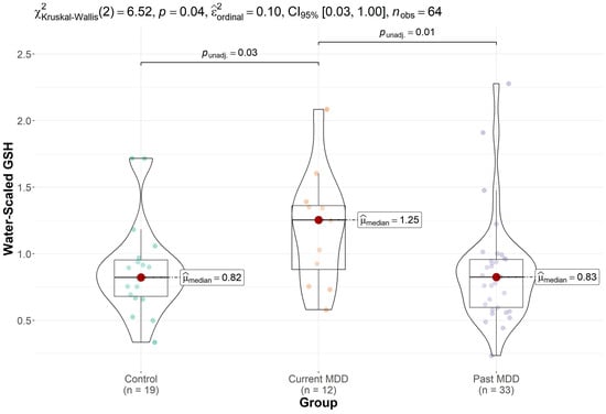 Trend-level groupwise differences in GSH were observed (p = 0.074), which became significant (p = 0.038, Kruskal–Wallis test) after removal of two statistical outliers (one control and one participant with past MDD) with GSH levels more than four times the group median values and more than seven standard deviations away from the group means. Post hoc comparisons showed elevated GSH levels in the participants with current depression (Figure 2), which were significantly increased in comparison to GSH levels in the controls (p = 0.034) and participants with past depression (p = 0.013). No differences in GSH levels were evident between controls and participants with past MDD (p = 0.846). Groupwise differences in GSH remained significant after excluding the participant taking antidepressants (p = 0.013) and after excluding an additional three participants taking any psychotropic medication prior to the study (p = 0.005). All participants on psychotropic medications were unmedicated for at least 3 months prior to the measurements.