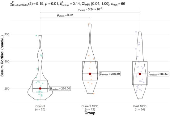 Groupwise differences in cortisol were also significant (p = 0.010, Kruskal–Wallis test). Post hoc comparisons revealed elevated cortisol levels in participants with current (p = 0.017) and past MDD (p = 0.005) relative to controls (Figure 3) but no significant differences in cortisol levels between the two MDD groups (p = 0.799).