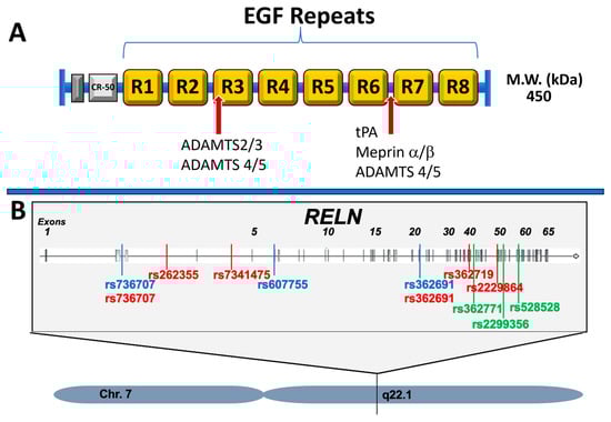 (A) Schematic representation of the Reelin protein and the proteases involved at its two main sites of cleavage: these include the plasminogen activator (tPA), the Meprin α/β, and the A disintegrin and metalloproteinase with thrombin motifs (ADAMTS). (B). Schematic representation of single nucleotide polymorphisms (SNPs) of the human RELN gene involved in schizophrenia (red), autism (blue), and Alzheimer’s disease (green). References are in the text in the respective sections. Exact locations are as follows: Variation:rs262355: Location:Chr7: 103,785,668; Variation:rs7341475: Location:Chr7: 103,764,368; Variation:rs607755: Location:Chr7: 103,749,507; Variation:rs362691: Location:Chr7: 103,610,714; Variation:rs362771: Location:Chr7: 103,548,441; Variation:rs362719: Location:Chr7: 103,545,430; Variation:rs2229864: Location:Chr7: 103,515,258; Variation:rs2299356: Location:Chr7: 103,669,375; Variation:rs528528: Location:Chr7: 103,748,638; and Variation:rs736707: Location:Chr7: 103,489,956. Source variation viewer https://www.ncbi.nlm.nih.gov/variation/view (accessed on 11 October 2023).