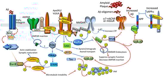 Alzheimer’s disease (AD) is a progressive neurodegenerative disease, which is characterized by the formation of extracellular amyloid plaques (Aβ or senile plaques) and intracellular neurofibrillary tangles resulting from tau protein hyperphosphorylation and aggregation. Pathological changes in tau and Aβ have been linked to the endocytosis of AMPARs and NMDARs, leading to synaptic dysfunction, impaired LTP, and cognitive decline [92,93]. Recently, a whole genome analysis identified the Reelin pathway (DAB1-RELN) to be associated with Alzheimer’s disease pathogenesis [94]