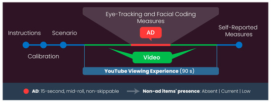 - RQ1: Does the presence of elements not related to advertising and overlaid on the advertising content (non-ad items’ presence) affect visual attention and time to notice associated with key ad elements (e.g., brand and product) during the view of the YouTube 15-s, mid-roll, non-skippable in-stream ad format?