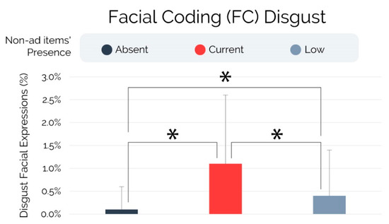 - RQ2: Does the presence of elements not related to advertising and overlaid on the advertising content (non-ad items’ presence) affect the occurrence of facial expressions of moral disgust detected during the view of the YouTube 15-s, mid-roll, non-skippable in-stream ad format?