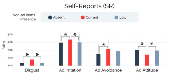 - RQ3: Does the presence of elements not related to advertising and overlaid on the advertising content (non-ad items’ presence) affect the self-reported measures of ad irritation, ad avoidance, ad attitude, and moral disgust concerning the view of the YouTube 15-s, mid-roll, non-skippable in-stream ad format?