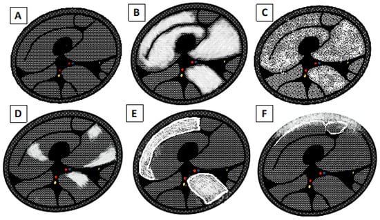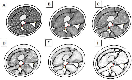 Schematic drawing of Mercuri’s classification of fatty atrophy grade. (A) Grade 0: Normal appearance of the muscle belly. (B) Grade 1: Early moth-eaten appearance with scattered small areas of fatty replacement. (C) Grade 2a: Late moth-eaten appearance, with numerous areas of fatty replacement with beginning confluence comprising less than 30%. (D) Grade 2b: Late moth-eaten appearance, with numerous areas of fatty replacement, with beginning confluence comprising 30–60%. (E) Grade 3: Washed-out, fuzzy appearance due to confluent areas of fatty replacement, with muscle still present at the periphery. (F) Grade 4: End-stage appearance, all muscle replaced by fat with complete fatty replacement.