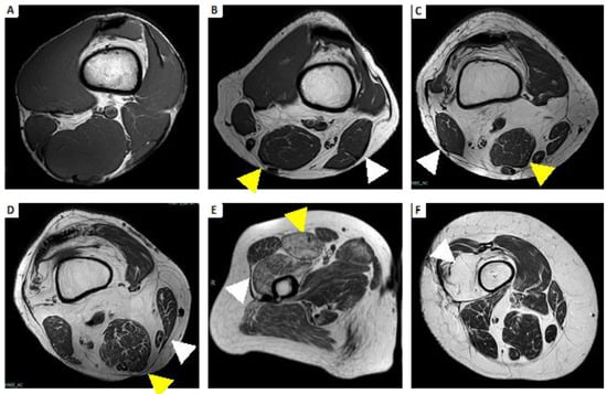 Example atrophy with fatty replacement using Mercuri’s classification. (A) Grade 0: All the muscles have regular intensity on T1-weighted imaging. (B) Grade 1: Fatty atrophy of semimembranosus (yellow arrowhead) and biceps femoris (white arrowhead), showing early moth-eaten appearance with scattered small areas of high signal on T1-weighted imaging. (C) Grade 2a: Fatty atrophy of semimembranosus (yellow arrowhead) and biceps femoris (white arrowhead), showing late moth-eaten appearance, with numerous areas of high signal on T1-weighted imaging, with beginning confluence comprising less than 30%. (D) Grade 2b: Fatty atrophy of semimembranosus (yellow arrowhead) and sartorius (white arrowhead), showing late moth-eaten appearance, with numerous areas of high signal on T1-weighted image, with beginning confluence comprising 30–60%. (E) Grade 3: Fatty atrophy of rectus femoris (yellow arrowhead) and vastus lateralis and vastus intermedius (white arrowhead), showing a fuzzy appearance due to confluent areas of high signal on T1-weighted imaging, with muscle still present at the periphery. (F) Grade 4: Fatty atrophy of vastus intermedius (white arrowhead); all muscle replaced by fat shows a homogeneous high signal on T1-weighted imaging.
