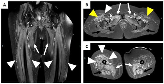 Acute changes are characterized by edema-like changes in the muscle, evaluated on STIR or T2-weighted images with a suppressed fat signal. It appears as focal or a diffuse hyperintensity of the involved skeletal muscles []. Intramuscular edema is non-specific and may also be found after trauma or overuse of the muscle in infective and inflammatory myopathies, neoplasm, rhabdomyolysis, recent vascular events, and even denervation (focal neuropathy) [,,].