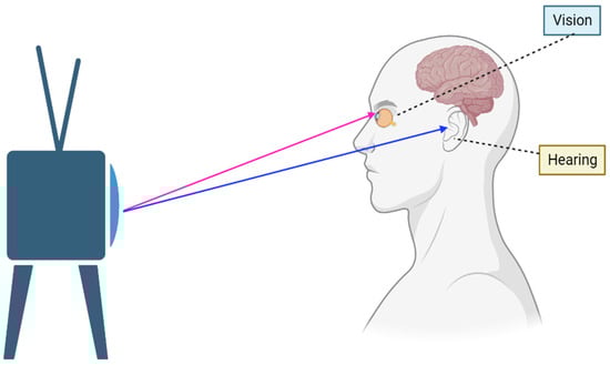Our world is full of information coded in different sensory modalities, e.g., touch, smell, taste, vision, hearing, vestibular, proprioceptive, and intersensory. Generally, more than one sensory system is activated by an object at the same time, and these signals are transformed, associated, and merged to help us perceive a coherent perception of the world [,]. For example, when you watch TV, you see pictures on the screen and hear sounds coming from the speaker to better understand the TV show (Figure 1). Since the information provided by each sense alone is usually noisy or unreliable, combining information across modalities allows one to improve the estimation of objects. Such a process is known as multisensory integration, which requires the sensory cues arising from a common cause to be weighted properly []. Multisensory integration is necessary for perception, motor transformation, decision-making, learning, and memory []. Deficits in multisensory integration often cause several problems such as dizziness []. In addition, some individuals diagnosed with schizophrenia and autism spectrum disorder exhibit multisensory processing failures []. Although schizophrenia and autism are distinct diagnoses and their mechanisms are still being explored, the patients share some characteristics in improper multisensory integration: they both integrate multisensory inputs over a longer time-binding window, which leads them to perceive asynchronous auditory and visual events as occurring simultaneously [,]. In the past decades, lots of work has focused on how different sensory modalities are integrated to enhance perception and facilitate behavior [,,].